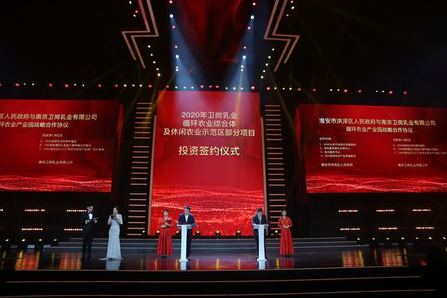 第三项是,与淮安市洪泽区人民政府签约的卫岗洪泽循环农业产业园项目,总投资1.8亿元,规划建设4000头奶牛标准化养殖基地和特色农副产品订单式生产示范区。