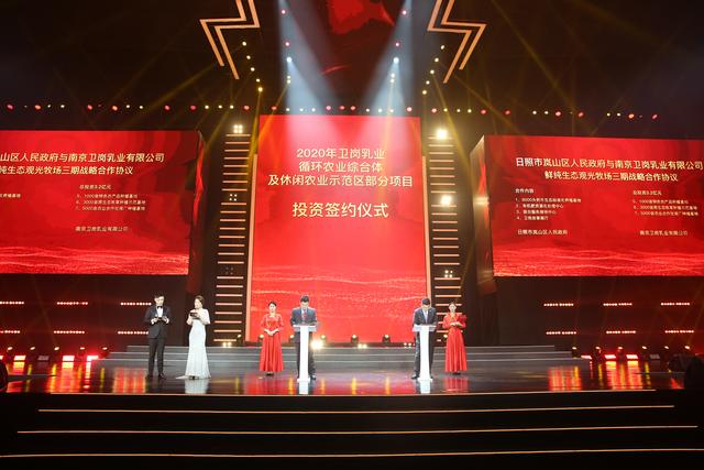 三项战略合作仪式即,第一项是,日照市岚山区人民政府与南京卫岗乳业有限公司鲜纯生态牧场三期战略合作协议签约仪式。规划建设8000头奶牛标准化养殖基地和优质农产品种植示范区,园区总占地约4500亩,计划2020年10月竣工,总投资3.2亿;